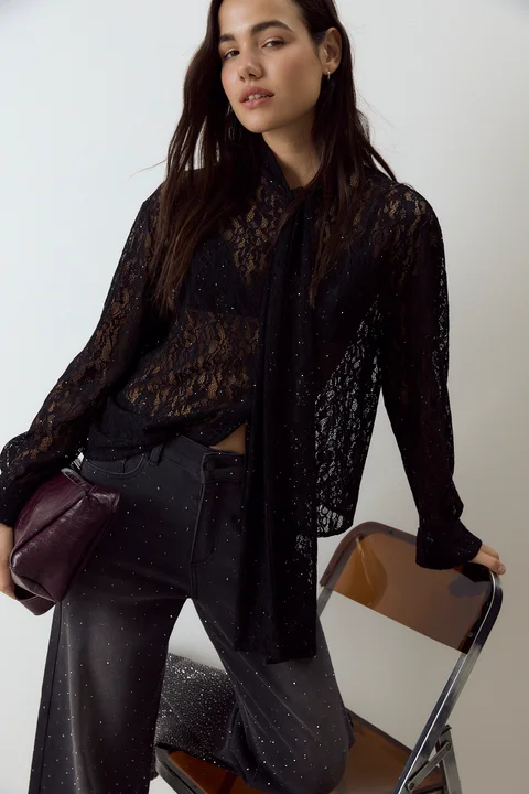 Camisa de encaje con lentejuelas con escote en "V" y lazo en el cuello. Composición: 90% Nylon 10% Spandex.