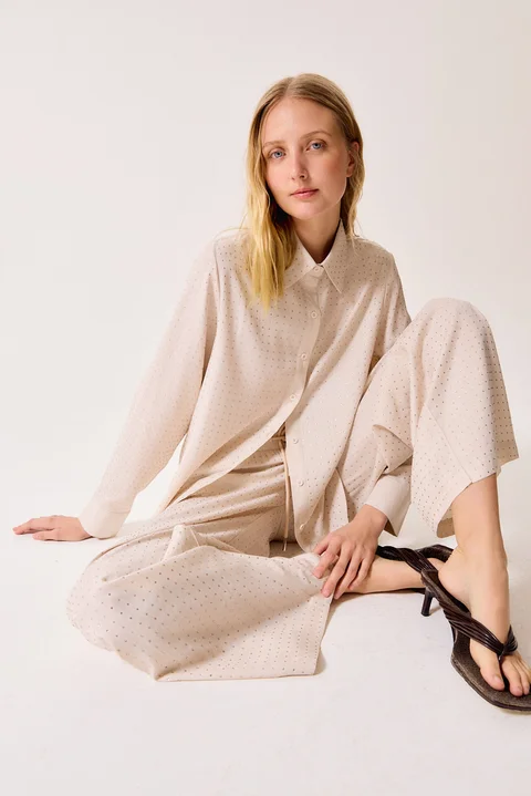 Camisa manga larga con cristales hot fix. Composición: 65% Viscosa 35% Poliéster