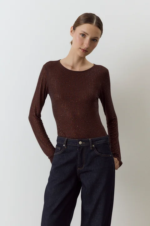 Body manga larga y escote redondo, con cristales hot fix. Composición: 95% Poliéster 5% Elastano.