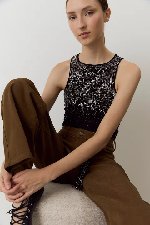 Body sin mangas de escote redondo, con cristales hot fix en degrade. Composición: 95% Poliéster 5% Elastano.
