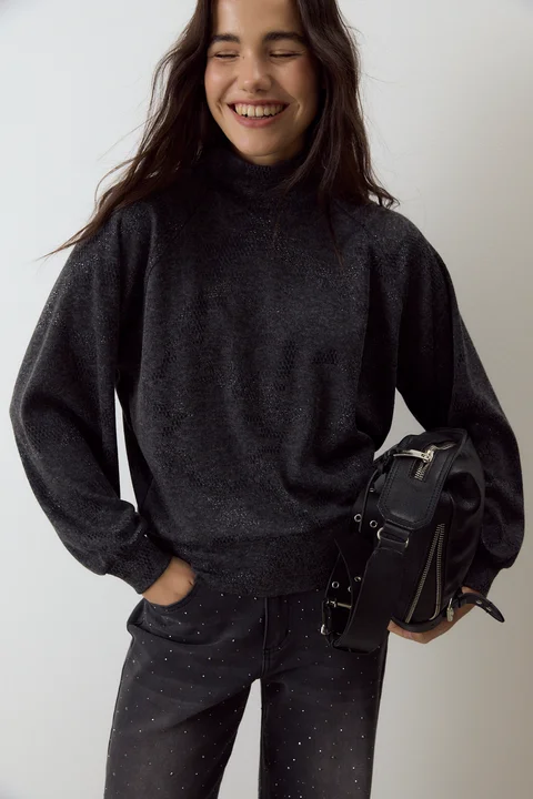 Buzo polera con manga ranglan y puños con diseño de pata de gallo en lurex. Composición: 92% Nylon 8% Spandex.