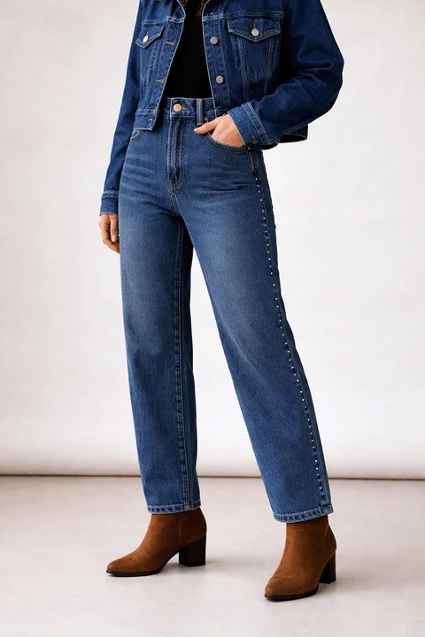 Denim mom con brillos en laterales y bolsillos. Composición: 96% Algodón 3% Poliéster 1% Elastano.