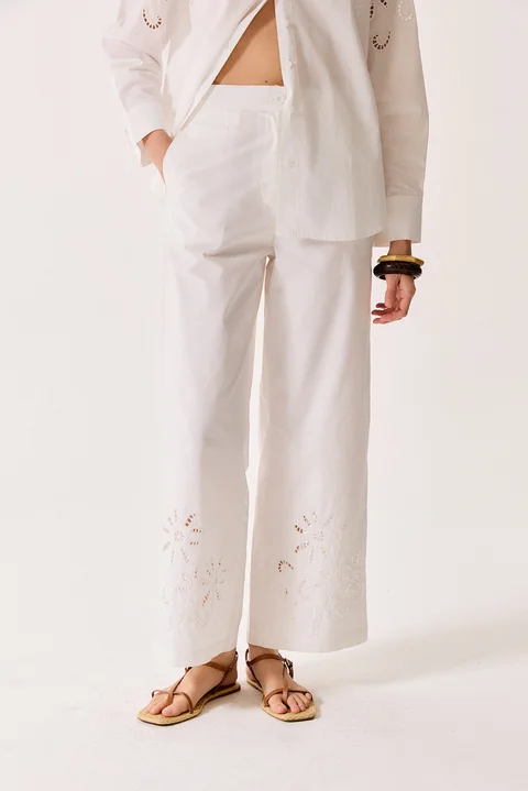 Pantalón con broderie de flores en el ruedo. Composición: 100% Algodón.