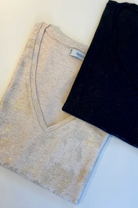 Remera manga corta, tejida con hilo de lurex, de escote en "V". Composición: 96% Poliéster 4% Spandex.