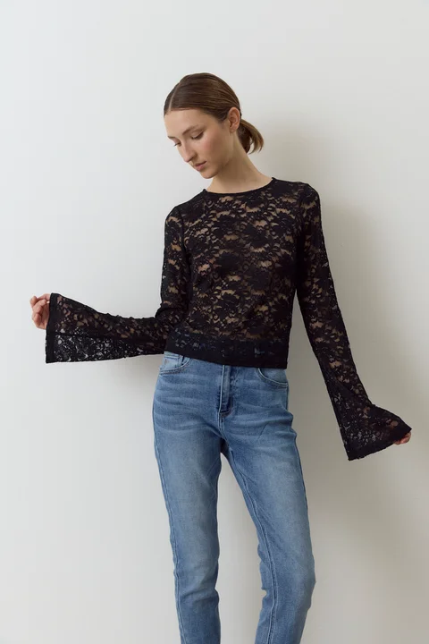 Remera de encaje y cristales hot fix, con manga larga y escote redondo. Composición: 95% Poliéster 5% Elastano.