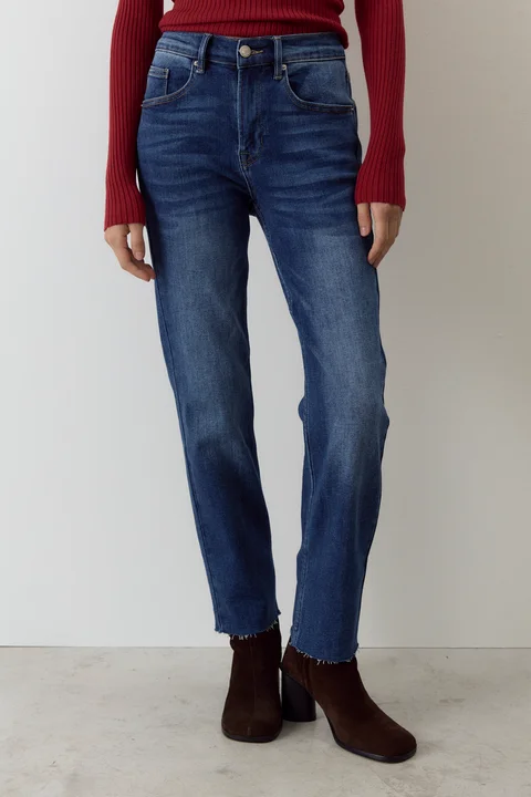 Denim straight clásico con lavado localizado. Composición: 60% Algodón 27% Poliéster 11% Viscosa 2% Elastano.