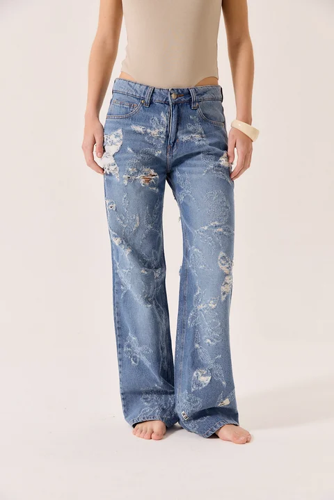 Straight de denim rígido con laser y desgastes. Composición: 100% Algodón. Curva par