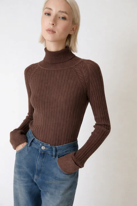 Sweater polera, con detalle de trenzas en sisas y mangas. Composición: 60% Viscosa 40% Poliamida.
