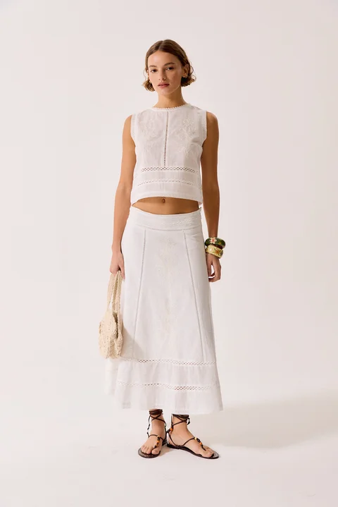 Top sin mangas de algodon bordado, con vainillas. Composicion: 100% Algodon.