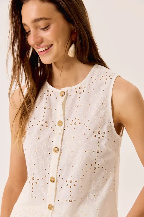 Top sin mangas de broderie, con guarda en el ruedo y botones. Composición: 100% Algodón