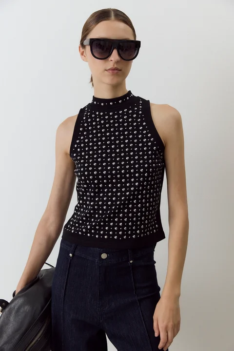 Top sin mangas y cuello polera, con cristales hot fix en distintos tamaños. Composición: 95% Algodón 5% Elastano.