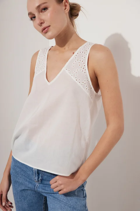 Top musculosa escote en v de voile combinado con broderie. Composición: 100% algodón