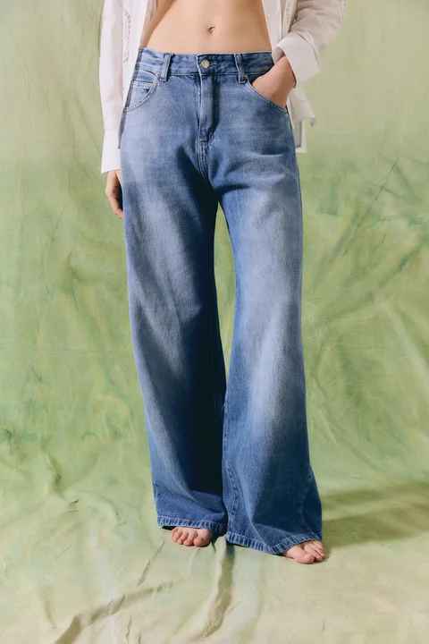 Wide leg de denim rígido con localizado. Composición: 100% Algodón. Todos los talles.