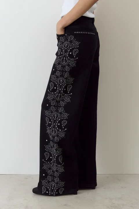 Denim wide leg con dibujo de cristales hot fix en laterales y bolsillos. Composición: 60% Algodón 27% Poliéster 11% Viscosa 2% Elastano.